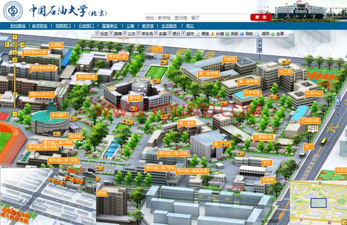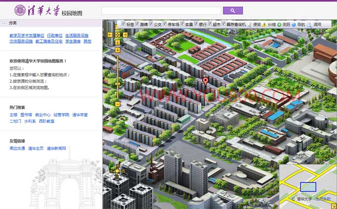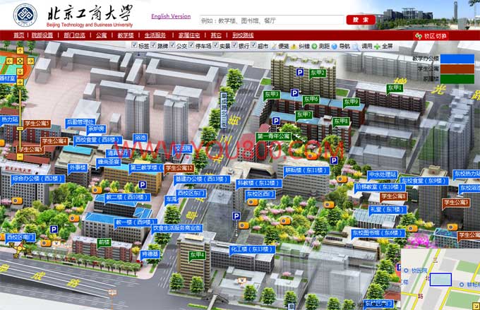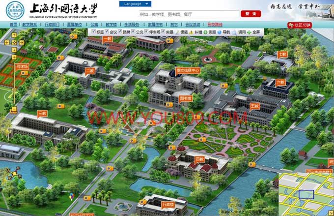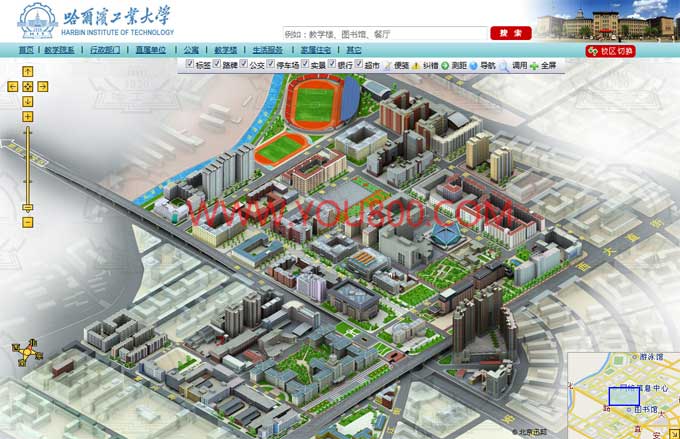 校園地圖系統(tǒng)可將校內(nèi)的所有機(jī)構(gòu)設(shè)置進(jìn)行導(dǎo)航定位,并提供地圖信息查詢(xún)包括機(jī)關(guān)部處、直屬單位、學(xué)院(系),提供單位詳情、電話(huà)、導(dǎo)航、本樓其他單位、網(wǎng)站鏈接、樓宇平面圖、全景瀏覽等。