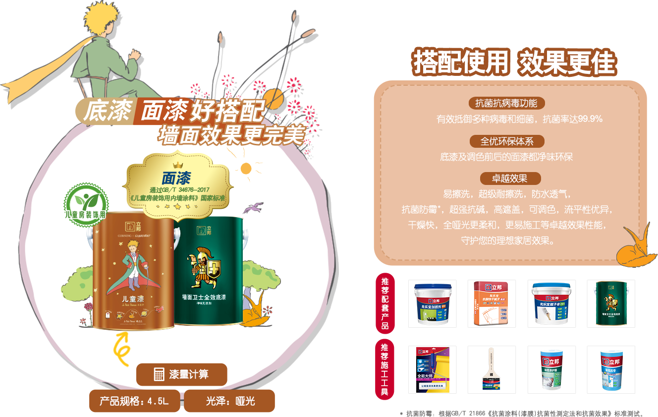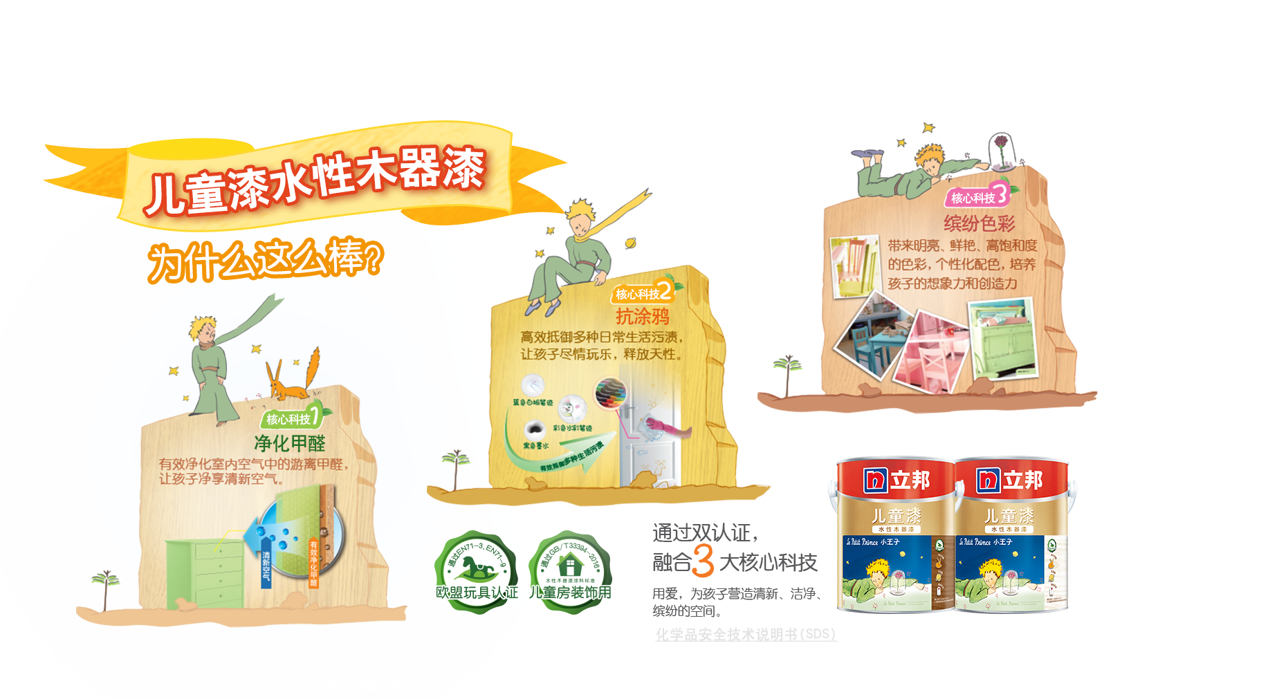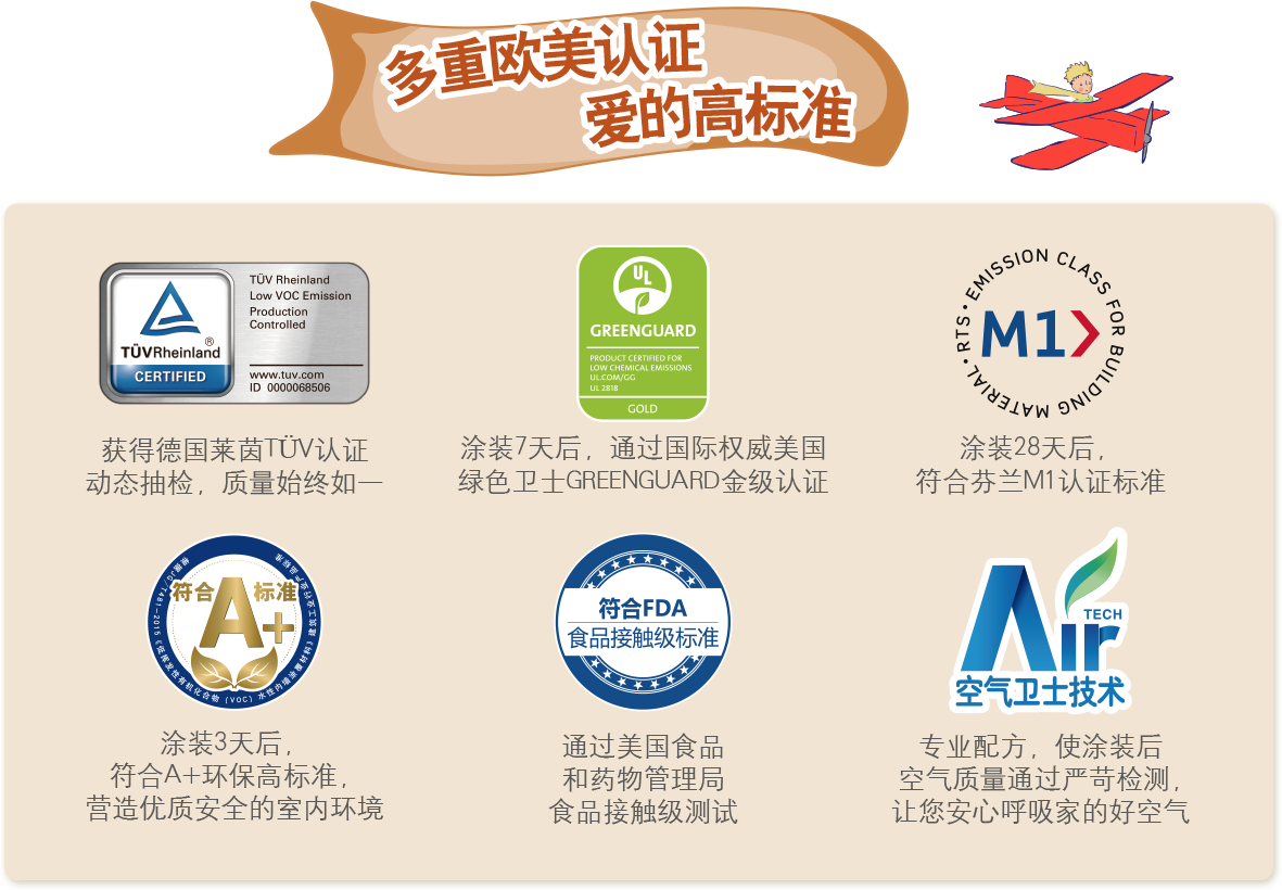 通過(guò)《歐盟玩具EN71-3》、《歐盟玩具 EN71-9》認(rèn)證、GB/T 33394-2016《兒童房裝飾用水性木器涂料》國(guó)家標(biāo)準(zhǔn)。